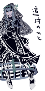 10歳とかで親が決めた結婚相手がいたけど戦乱やらなにやらで死んでしまって一家離散して、そこからなんとなく喪に服した服を着ているようなイメージです。 喪に服したデザインドレスにクリノリン。蔦が絡む廃洋館のようなイメージです。ふんわりとしたドレスは動いたときに軽やかに動くようなイメージで。 |