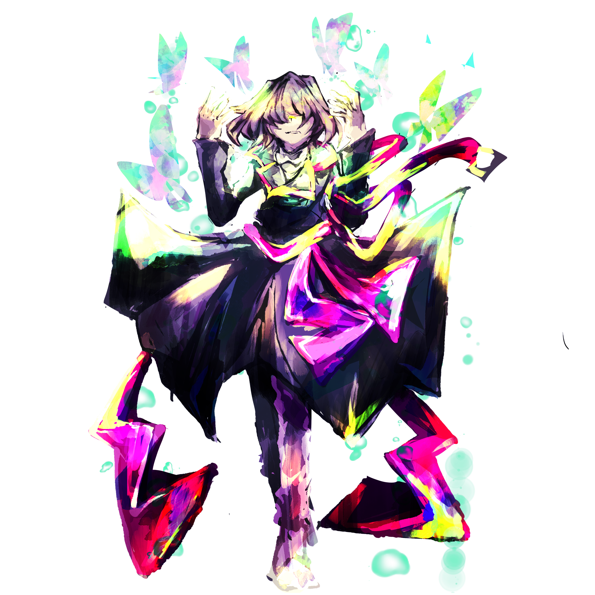 ・性別不祥な雰囲気に。ヒールでさりげなくお姉さんアピール。 ・配色は髪色含めて地味目。その分オーダーのネオンカラーは派手に。 ・動きの少ない役割(支援)だとわかっていたので、立っているだけでも華になるようなデザインに。 ・戦闘差分は演出で蝶をよく使っていたのでそれをベースに。 ・PCへの持ち込み設定で培養槽と縁があったので緑の泡をさりげなく取り込んでいます。